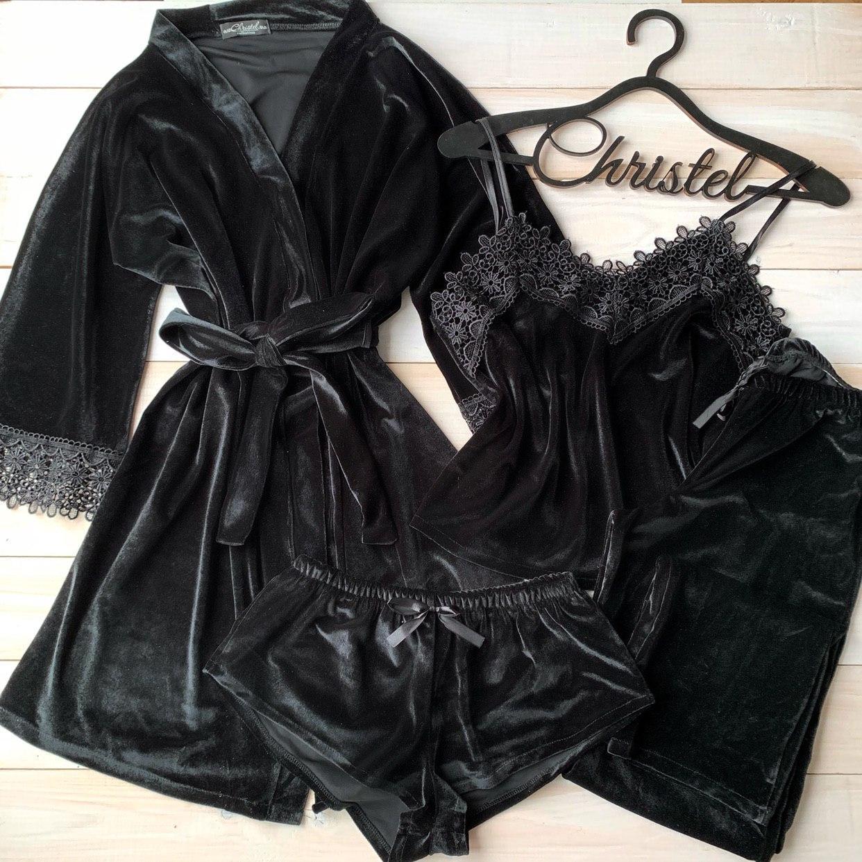 Комплект піжама четвірка (халат, майка, штани, шорти) оксамит з мереживом Christel 061 чорний M